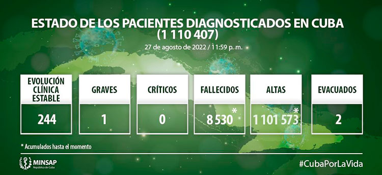 De 1 millón 110 mil 407 pacientes diagnosticados con la enfermedad, se mantienen ingresados 245, de ellos 244 con evolución clínica estable. Se acumulan 8 mil 530 fallecidos (0 en el día), letalidad de 0,77 % vs 1,07 % en el mundo y 1,6% en las Américas; dos evacuados, 57 retornados a sus países, en el día hubo 58 altas, se acumulan 1 millón 101 mil 573 (99,2%).