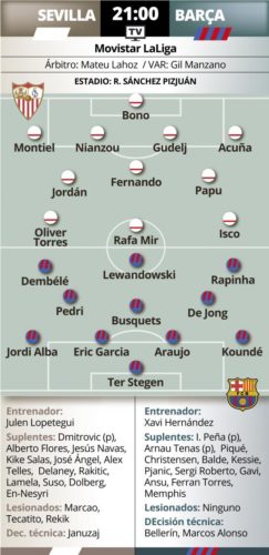 El prometedor estreno en la Liga del Bota de Oro Robert Lewandowski, ya líder en la tabla del Pichichi con cuatro goles, ya impone a los rivales. Xavi tiene mucho donde elegir. pero pocas razones para tocar aquello que ha funcionado en los dos últimos partidos, con ocho goles a favor y uno en contra. Claro que la inminencia del debut en una Champions League que se ha convertido en un reto ineludible tras los fiascos de los últimos años pueden justificar cualquier posible rotación. Una de ellas podría ser la entrada de Frenkie de Jong y no sería descartable la presencia de Jordi Alba, pese a la prometedora irrupción de Alejandro Balde en el lateral zurdo.