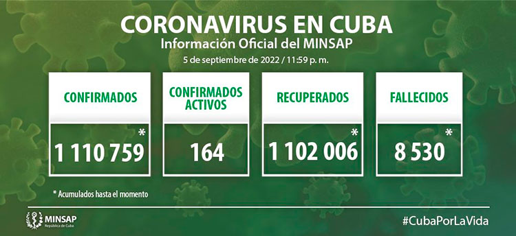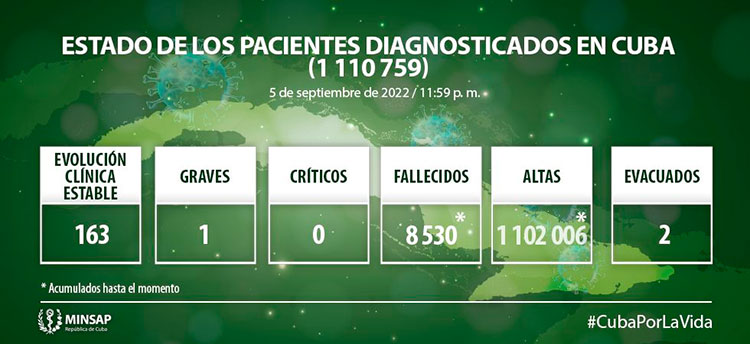 De 1 millón 110 mil 759 pacientes diagnosticados con la enfermedad, se mantienen ingresados 164, de ellos 163 con evolución clínica estable. Se acumulan 8 mil 530 fallecidos (no se reportan fallecidos en el día), letalidad de 0,77 % vs 1,07 % en el mundo y 1,60 % en las Américas; dos evacuados, 57 retornados a sus países, en el día hubo 43 altas, se acumulan 1 millón 102 mil 006 (99,2%). Se atienden en los Cuidados Intensivos 1 paciente grave confirmado.