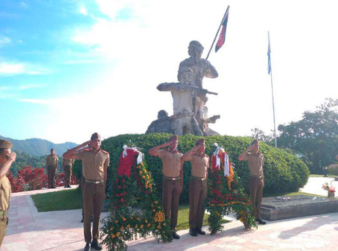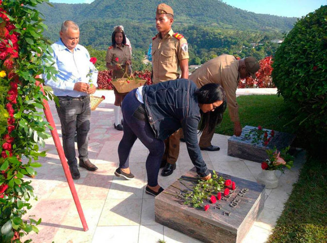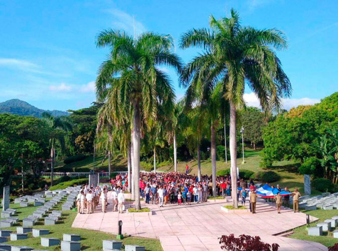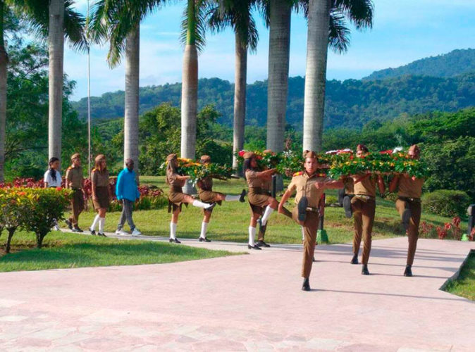 Posteriormente a la ceremonia de guardia de honor, a cargo de estudiantes de la Escuela Militar Camilo Cienfuegos de Contramaestre, la presidencia dedicó flores sueltas al jefe militar, ys y compañeros de lucha.