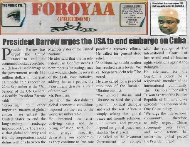 Con llamado a portada, el diario Foroyaa resalta hoy la exhortación hecha en la ONU por el presidente de Gambia, Adama Barrow, a EEUU para que levante el prolongado bloqueo que le impone a Cuba.