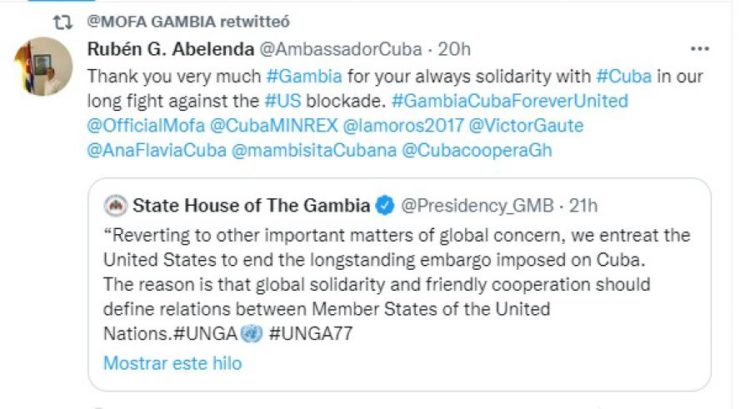 De igual forma, los Twitter oficiales de la Casa de Estado de Gambia y de su Ministerio de Asuntos Exteriores reprodujeron el llamado del presidente en la AGNU-77 a terminar con el cerco económico, comercial y financiero a Cuba.