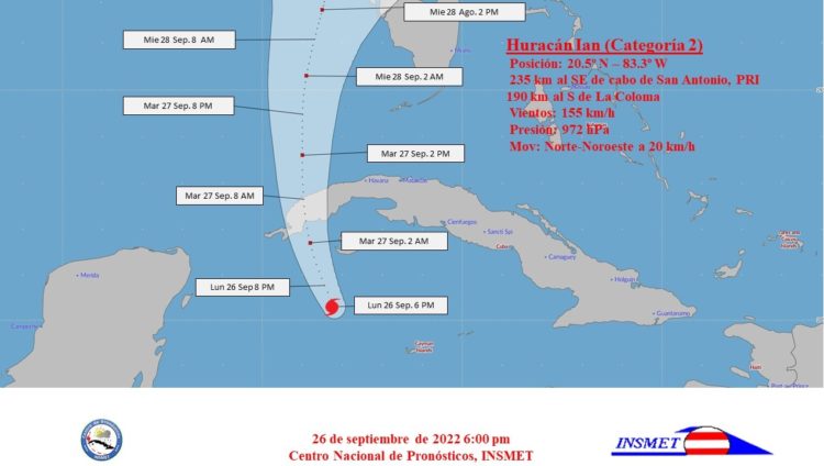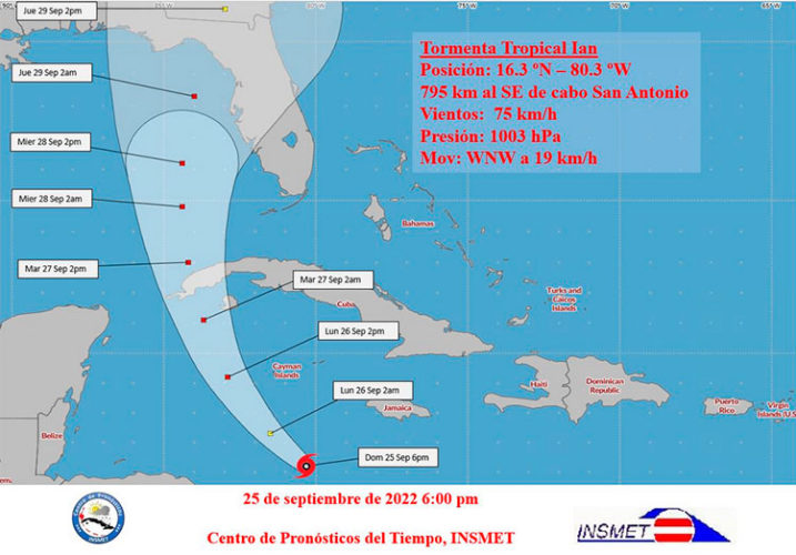 El Centro de Pronósticos del Instituto de Meteorología alertó que dada su posición y trayectoria pronosticada, Ian pudiera provocar en el territorio cubano vientos y lluvias fuertes e intensas e inundaciones costeras en zonas bajas del litoral sur a partir del lunes.