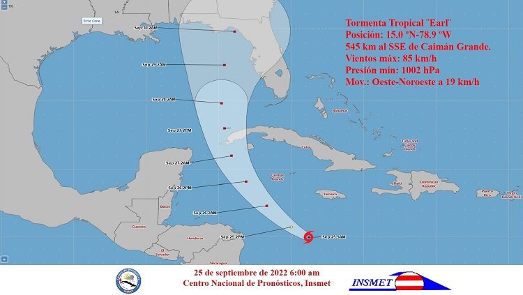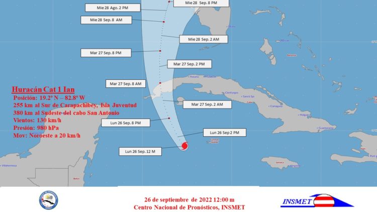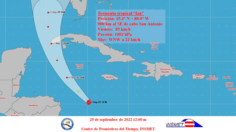 El Centro de Pronósticos del Instituto de Meteorología mantiene una estrecha vigilancia sobre la evolución y futura trayectoria de este organismo ciclónico tropical, debido al peligro potencial que representa para el occidente de Cuba. Dada su posición y la trayectoria pronosticada, la tormenta tropical Ian pudiera provocar en el occidente de Cuba vientos y lluvias fuertes e intensas, así como inundación costera en zonas bajas del litoral sur a partir del lunes 26 de septiembre.