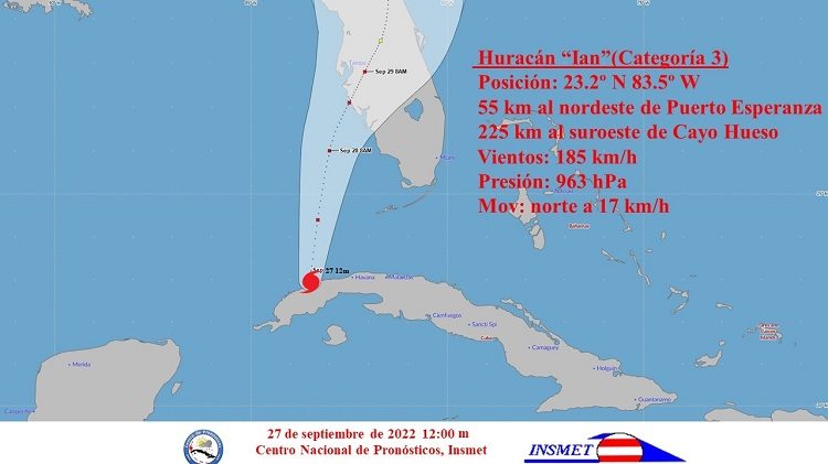 Ian alcanza la categoría 3 en la escala Saffir-Simpson, con 185 km/h. Próximo a tocar tierra al sur de #PinardelRío. pic.twitter.com/NRXOgQLCT3— Centro de Pronósticos, Insmet (@cnp_insmet_cuba) September 27, 2022