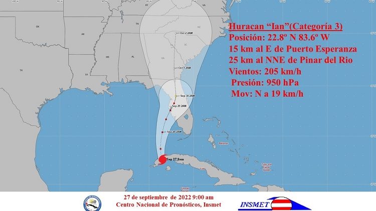Según el más reciente Aviso del Insmet, el número 21, el centro de Ian fue estimado a las nueve de la mañana en los 22.8 grados de latitud Norte y 83.6 grados de longitud Oeste, sobre la costa norte de Pinar del Río, por las inmediaciones de Puerto Esperanza. Mantiene vientos máximos sostenidos de 205 kilómetros por hora, su presión mínima central ha descendido a 950 hectoPascal y se mueve rumbo al norte a 19 kilómetros por hora.