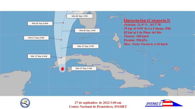 El centro de Ian fue estimado a las seis de la mañana en los 22.4 grados de latitud Norte y 83.7 grados de longitud Oeste, posición que lo sitúa a unos 25 kilómetros al sur de Viñales y 40 kilómetros al sur de Puerto Esperanza, posible punto de salida al mar por la costa norte de Pinar del Río.