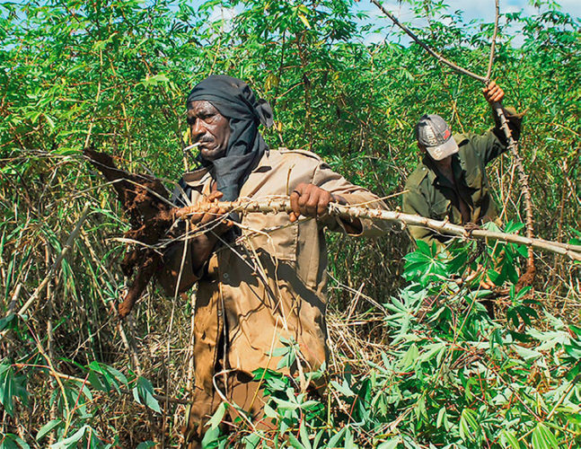 Cerca, en la UBPC Dos de Diciembre, arrancan cangres de yuca del fango, tremenda faena cuando el sol y la evaporación toman su mayor punto al mediodía y a los hombres les corre el sudor. Como los agropecuarios tristemente han dejado su tradicional sombrero los veo vulnerables aunque envuelvan la cabeza en paños negros.