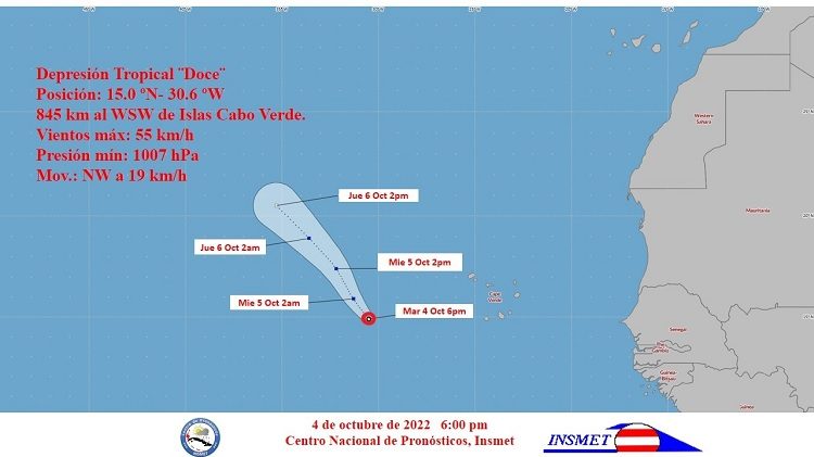 Durante el día de hoy el área de bajas presiones localizado sobre el Atlántico oriental, mostró una mejor organización en sus áreas de lluvias y tormentas eléctricas alrededor de su centro y se convirtió en la depresión tropical Doce. Los vientos máximos sostenidos son de 55 kilómetros por hora, con rachas superiores y tiene una presión central de 1007 hectoPascal. Se mueve al noroeste a 19 kilómetros por hora.