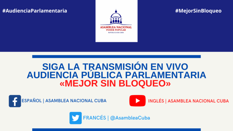 Los usuarios podrán seguir la transmisión en vivo de la Audiencia Pública Parlamentaria a partir de las 10:00 a.m. en idioma español por la página oficial de la Asamblea Nacional del Poder Popular en Facebook (Asamblea Nacional Cuba); en idioma inglés por el canal de YouTube del legislativo cubano (Asamblea Nacional Cuba); y en lengua francesa por la cuenta en Twitter del Parlamento cubano (@AsambleaCuba).