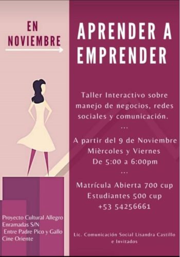A eso apuesta el Taller Interactivo Sobre Manejo de Negocios, Redes Sociales y Comunicación que ya se anuncia en la ciudad santiaguera, a partir del próximo nueve de noviembre, cada miércoles y viernes de 5 a 6 de la tarde.