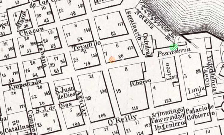 - La Pescadería fue un modesto e insalubre establecimiento del siglo XVIII ubicado muy cerca de El Boquete y de La Catedral. En 1835 es sustituido por una edificación moderna, financiada por el comerciante catalán Francisco Marty y Torrens, quien se dedicaba al negocio de la pesca, la navegación y el tráfico ilegal de indios mayas a Cuba. El nuevo inmueble, cuya ubicación está marcada en verde en el mapa de 1857, fue una obra de mampostería de estilo neoclásico de planta rectangular con aproximadamente 49 m de largo y 16 m de ancho, poseía mostradores recubiertos de mármol blanco y piso enlosado. La pescadería funcionó hasta 1899.[/note]