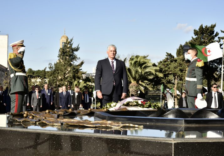 Con honores a la historia y a los mártires argelinos comenzó su primera jornada de actividades en este país, el Presidente de la República de Cuba junto a la delegación que lo acompaña. En el Monumento de los Mártires, lugar emblemático de la capital argelina que se erige en una de las colinas del paisaje, colocó el Jefe de Estado una ofrenda floral en cuya cinta podía leerse: «En nombre del pueblo de Cuba, a los mártires de la independencia Argelina».