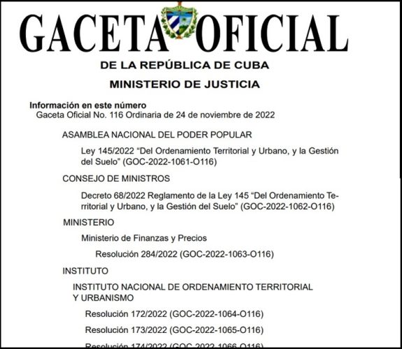 La Ley 145 del Ordenamiento territorial y urbano y la gestión del suelo entrará en vigor dentro de 120 días, a partir de este jueves 24 de noviembre cuando fue publicada en la Gaceta Oficial, explicó en conferencia de prensa Diana Rosa Suárez, directora jurídica del Instituto Nacional de Ordenamiento Territorial y Urbanismo (Inotu).