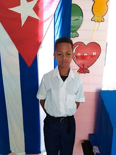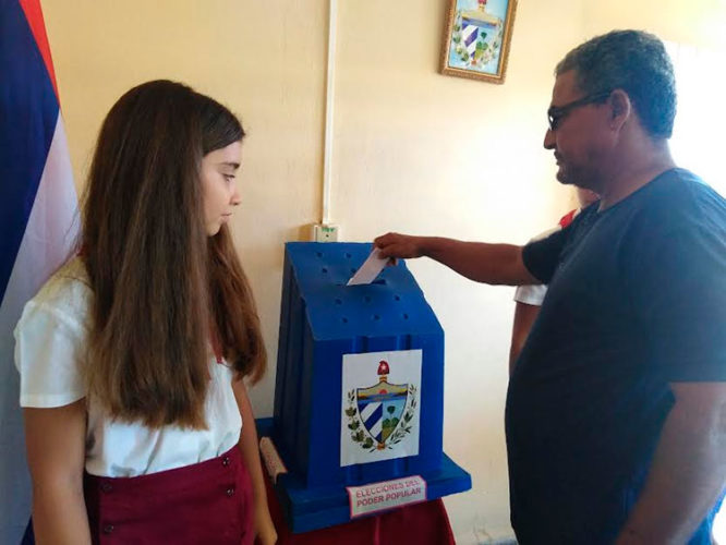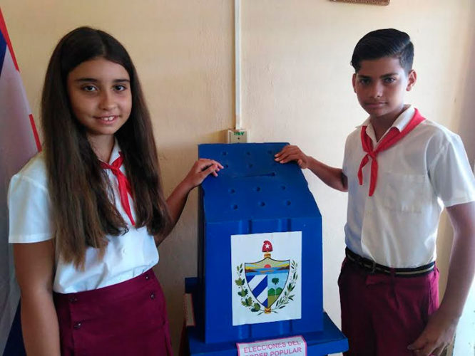 Laura Elena Guerrero Denis y Jonathan Yoel Leyva Mesa cuidan la urna del colegio número 2 de la circunscripción 55, del Consejo Popular América Latina, ubicado en la escuela Álvaro Morel Álvarez. Y lo hacen con honor, pues como dice Laura «a diferencia de otros países que son policías, aquí somos los niños los encargados de proteger el voto».