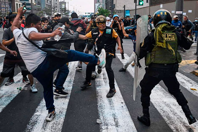 Simpatizantes de Pedro Castillo chocan con la policía el 9 de diciembre de 2022, frente al congreso de Perú. Foto: Ernesto Benavides (AFP)