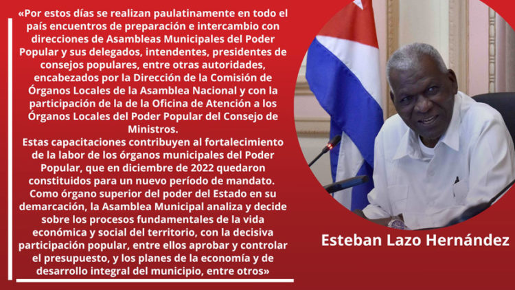 Estas reuniones de capacitación contribuyen al fortalecimiento de la labor de los órganos municipales del poder popular, los cuales fueron constituidos en 2022 para un nuevo período de mandato, recordó Lazo en su mensaje.