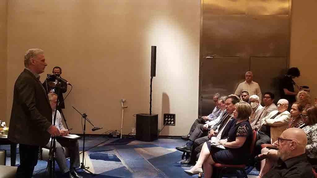 En el ameno encuentro, al que asistió también el ministro de Relaciones Exteriores, Bruno Rodríguez, y el destacado cineasta y ministro argentino de Cultura, Tristán Bauer, Díaz Canel recordó que desde aquel primer encuentro en esta capital, en 2019 a hoy, los tiempos han cambiado.
