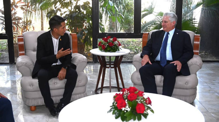 Miguel Díaz-Canel Bermúdez, Primer Secretario del Comité Central del Partido Comunista de Cuba y Presidente de la República, recibió hoy en el Palacio de la Revolución a Andrónico Rodríguez, Presidente de la Cámara de Senadores del Estado Plurinacional de Bolivia, y al Senador Leonardo Loza.