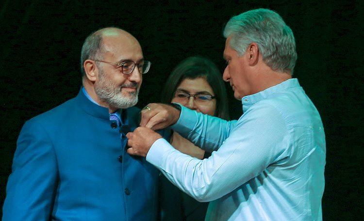 Durante la ceremonia, el presidente cubano impuso la medalla de la amistad a Ghassan Ben Jeddou, director del canal de televisión satelital panárabe Al Mayadeen.