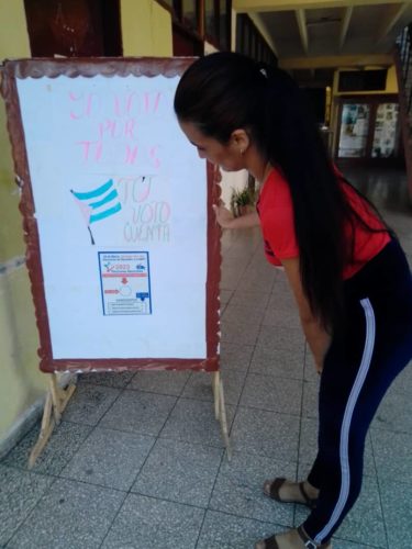Jóvenes estudiantes de Derecho de la Universidad de Oriente son activos protagonistas del proceso de explicar en diferentes sitios detalles y características de estas elecciones generales. Foto: Betty Beatón