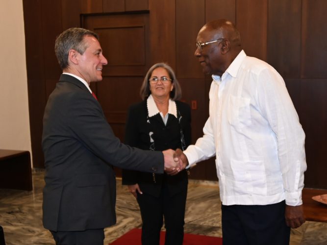 Tras agradecer la calidez del recibimiento, el Jefe del Departamento Federal de Asuntos Exteriores de la Confederación Suiza comentó que esta visita —la primera que realiza un Consejero Federal suizo a Cuba— le ha permitido apreciar la belleza de la población cubana, así como del arte, de la geografía y de la arquitectura, y a su vez también las dificultades que el país está atravesando.