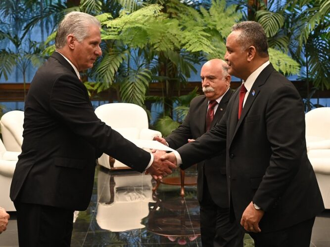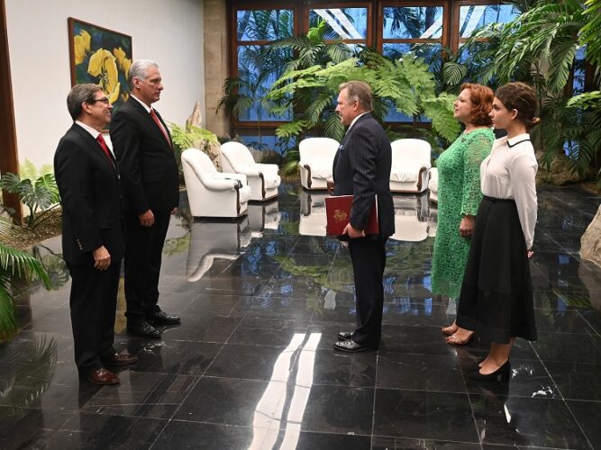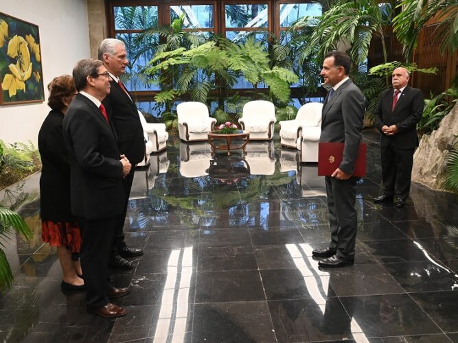 Durante las ceremonias protocolares —en las cuales el Jefe de Estado estuvo acompañado por el miembro del Buró Político y ministro de Relaciones Exteriores, Bruno Rodríguez Parrilla— el mandatario aseguró a los diplomáticos que tendrán todo la colaboración del Gobierno y la Cancillería para el desempeño exitoso de sus funciones en la Isla.