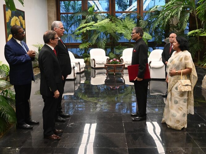 Luego de recibir las Cartas Credenciales que acreditan al excelentísimo señor Khalilur Rahman como embajador extraordinario y plenipotenciario de la República Popular de Bangladesh en Cuba, el Presidente Díaz-Canel recordó que este año se cumple el 50 aniversario del establecimiento de las relaciones entre ambos países.