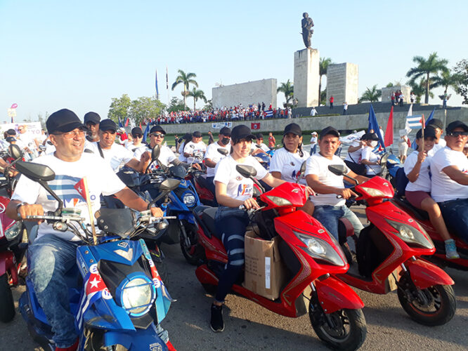 María Guedes Fabregat, secretaria del buró sindical de la Empresa Geominera del Centro, perteneciente al Sindicato Nacional de los Trabajadores de Energía y Minas(SNTEM), desfiló junto a sus afiliados en motorina por la Plaza del Che.