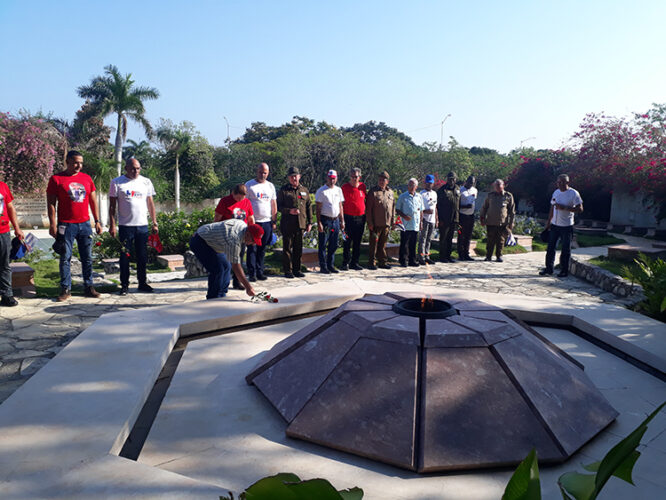 Yudi Rodríguez Hernández, miembro del Secretariado del Comité Central del PCC, y René Mesa Villafaña, ministro de la Construcción, depositaron un ramo de flores junto al nicho de Guevara, seguidamente se realizó un minuto de silencio por los héroes.