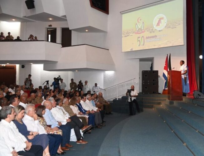 Una sincera felicitación del Partido Comunista y el pueblo cubano, fue transmitida al pueblo de la República Árabe Saharaui Democrática en el acto por el 50 Aniversario de la fundación del Frente Polisario, al que asistió el Primer Secretario del Comité Central del Partido y Presidente de la República, Miguel Díaz-Canel Bermúdez.