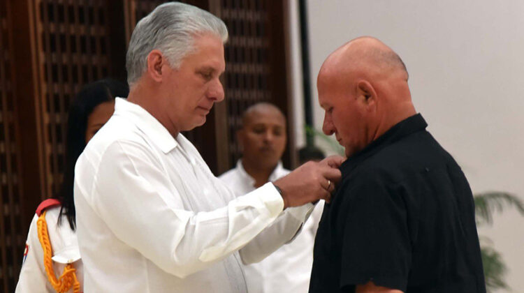 Durante la ceremonia, realizada en el Salón de Protocolo de El Laguito, el mandatario cubano entregó el título honorifico de Héroe del Trabajo de la República a Reydenis González Céspedes, presidente por más de 25 años de la Cooperativa de Producción Agropecuaria Calixto Sarduy, de las Tunas, y la Orden 17 de Mayo a dos campesinos de prolongada trayectoria revolucionaria al servicio de la tierra.