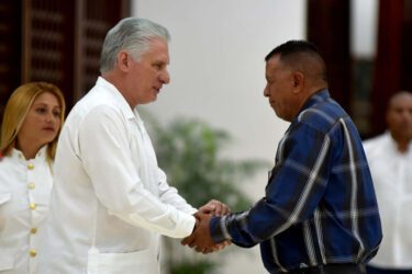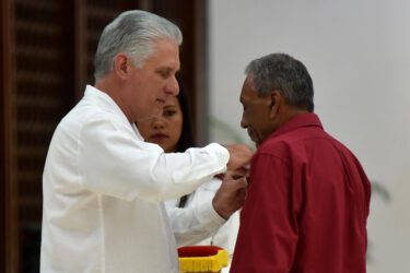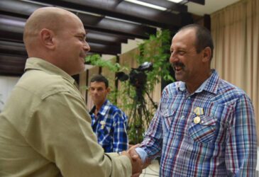Durante la ceremonia, realizada en el Salón de Protocolo de El Laguito, el mandatario cubano entregó el título honorifico de Héroe del Trabajo de la República a Reydenis González Céspedes, presidente por más de 25 años de la Cooperativa de Producción Agropecuaria Calixto Sarduy, de las Tunas, y la Orden 17 de Mayo a dos campesinos de prolongada trayectoria revolucionaria al servicio de la tierra.