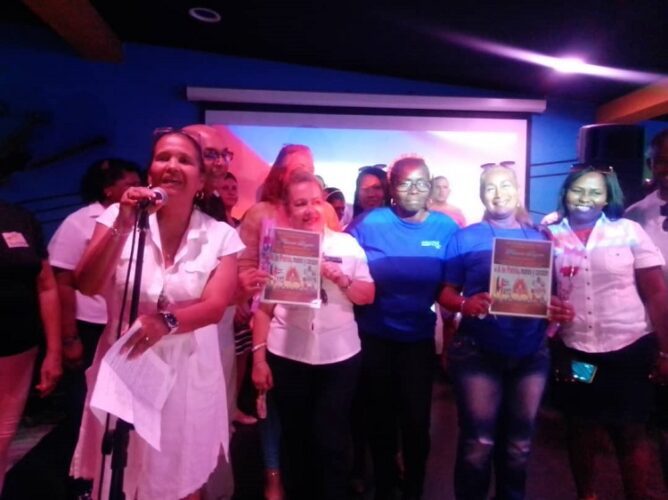 Rafaela Matos Ross, secretaria general del SNTHT en Santiago de Cuba junto a los representantes de dos colectivos que marcan liderazgo sindical en la provincia: Palmares e Islazul. Foto: Betty Beatón Ruiz
