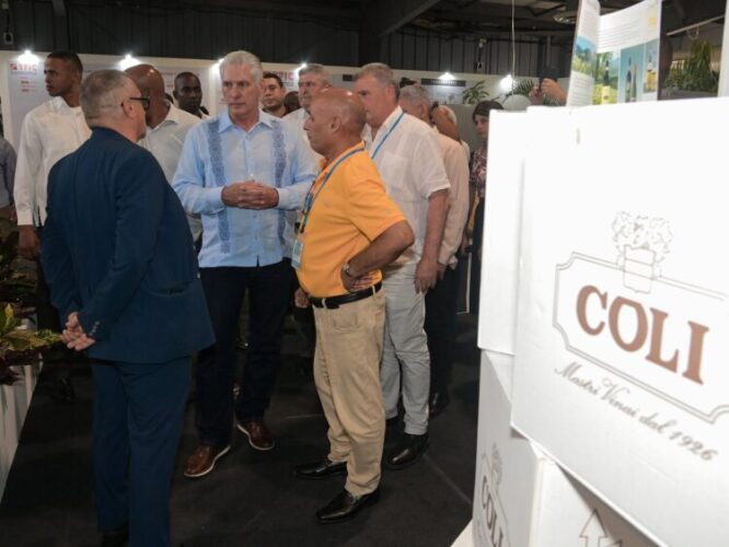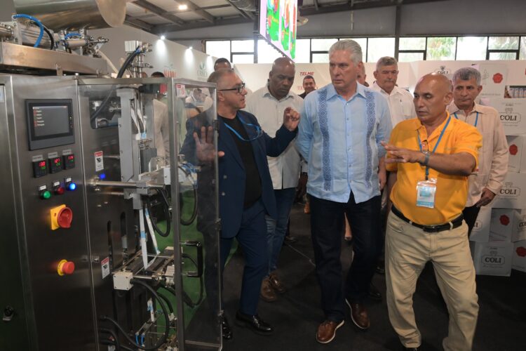 Díaz-Canel valoró: “Hay emprendimientos aquí muy interesantes, porque ya son firmas extranjeras que se han ido vinculando a la industria nacional, algunos se han ido encadenando con productores agropecuarios; o sea, han ido cerrando ciclos, desde la producción agropecuaria, con financiamiento diferenciado, hasta la producción de un grupo de productos muy importantes para surtir determinados mercados -como el del turismo, y otros-”.
