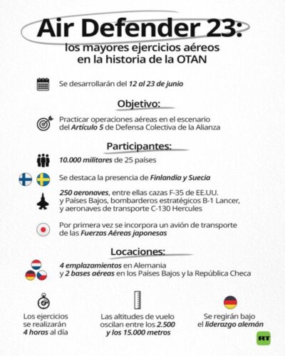 Cientos de aviones militares de 24 países se ejercitan en cielos europeos muy cerca de Rusia, desde el 12 y hasta el 23 de junio, bajo el comando de la Fuerza Aérea de Alemania como parte del ejercicio Defensor del Aire 23, organizado por la Organización del Atlántico Norte (Otan).