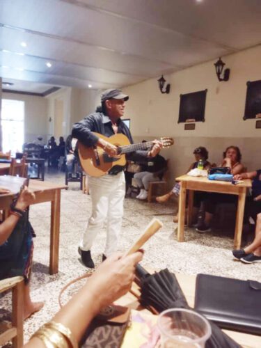 Un espacio animado por un escritor de rigor y alta emotividad, quien es además trovadorjacarandoso capaz de mantener en vilo a un público entre boleros y guarachas, moviéndose con su guitarra y su voz de mesa en mesa, sin descuidar algunos momentos en que cede la escena a otros creadores, a los cuales invita y acompaña musicalmente.