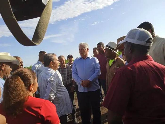 En el polo productivo El Alambre, ubicado en el municipio de San Luis, el mandatario se interesó por la siembra y cosecha de los alimentos así como su comercialización. En intercambio con el usufructuario Rody Carmenaty – que atiende 15 hectáreas que contienen yuca, plátano, fruta bomba y otros cultivos varios-, Diaz-Canel exhortó «a que toda Cuba esté así».