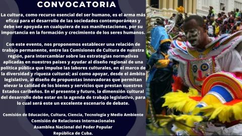 Las comisiones de Educación, Cultura, Ciencia, Tecnología y Medio Ambiente, y de Relaciones Internacionales, de la Asamblea Nacional del Poder Popular convocaron a los miembros de las Comisiones de Cultura de los Parlamentos del Caribe al encuentro «El rol de los Parlamentos en la defensa de las culturas populares y las tradiciones de nuestros pueblos caribeños».