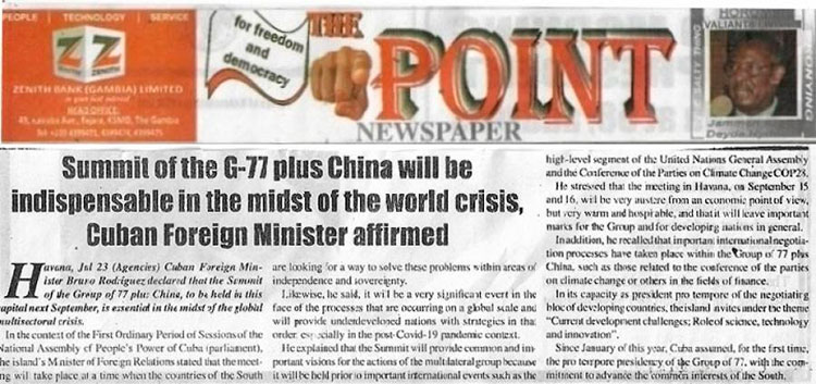 Banjul, 24 jul.- El diario gambiano The Point se hizo eco hoy de declaraciones del canciller cubano, Bruno Rodríguez Parrilla, sobre lo indispensable que será frente a la actual crisis mundial la celebración en La Habana en septiembre venidero de una nueva Cumbre del G-77+China.
