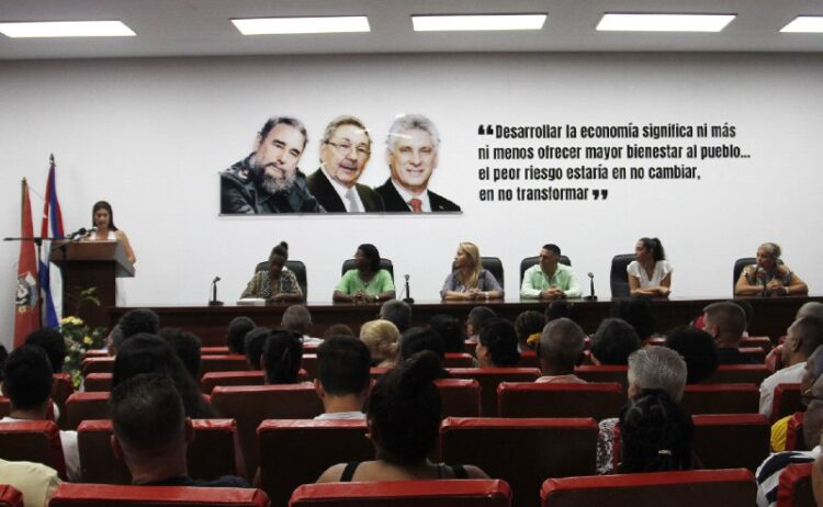 El acto estuvo presidido por Gertrudis Simón, jefa del Departamento de Relaciones Internacionales de la Central de Trabajadores de Cuba y otros dirigentes.