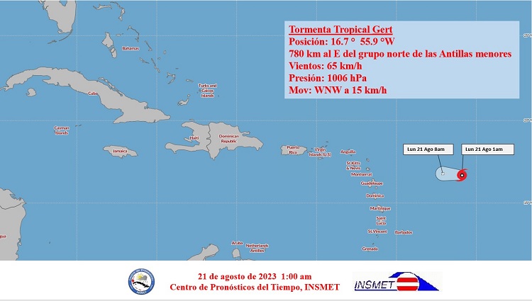 La tormenta tropical Gert, durante el dia continuo perdiendo en organización e intensidad con rapidez y ahora es una débil depresión tropical con valor de 1008 hectoPascal, ubicada en aguas del Atlántico a unos 645 kilómetros al este de las islas del grupo norte de las Antillas menores.