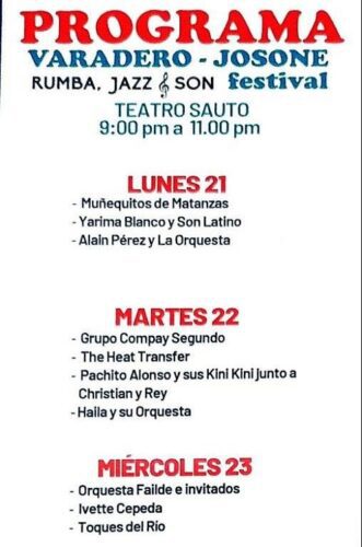 Además de los matanceros se escuchará también a Yarima Blanco y Son Latino, a Alaín Pérez y La Orquesta, al grupo Compay Segundo, Pachito Alonso y sus Kini Kini junto junto a Cristian y a Rey, a Haila y su Orquesta, a Ivette Cepeda, y a Toques del Río.