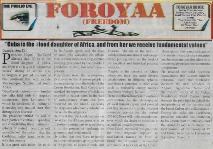 El cotidiano exalta declaraciones hechas por el mandatario caribeño en Angola en las cuales afirmó que “Cuba es hija de sangre de África, y de ella recibimos valores fundamentales”.