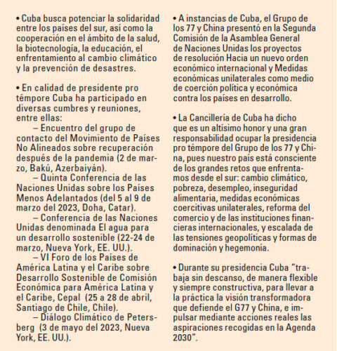 En ese contexto el Grupo de los 77 y China se han convertido en un interlocutor proactivo. Cuba ocupa este año la presidencia pro témpore del organismo por primera vez y se ha propuesto revalidar el multilateralismo y el axioma de que en la unión está la fuerza.