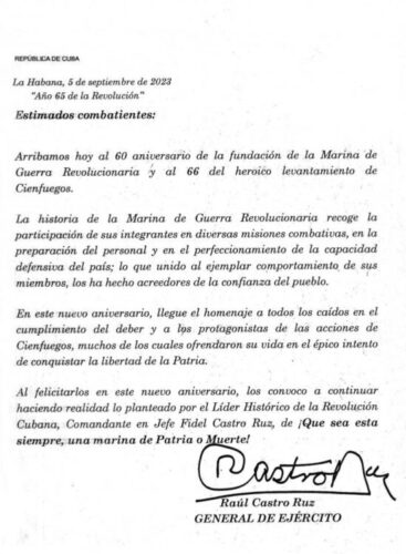 Al felicitarlos en este nuevo aniversario, los convoco a continuar haciendo realidad lo planteado por el Líder Histórico de la Revolución Cubana, Comandante en Jefe Fidel Castro Ruz, de ¡Que sea esta siempre, una marina de Patria o Muerte!