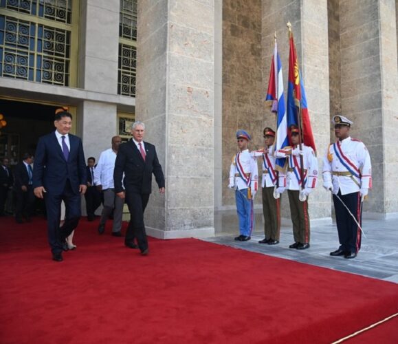 El Salón Portocarrero en el Palacio de la Revolución fue escenario, en la tarde de este jueves, de la ceremonia con la cual el Primer Secretario del Comité Central del Partido Comunista y Presidente de la República de Cuba, Miguel Díaz-Canel Bermúdez, dio el Recibimiento Oficial al Excelentísimo Señor Ukhnaagiin Khürelsükh, Presidente de Mongolia.