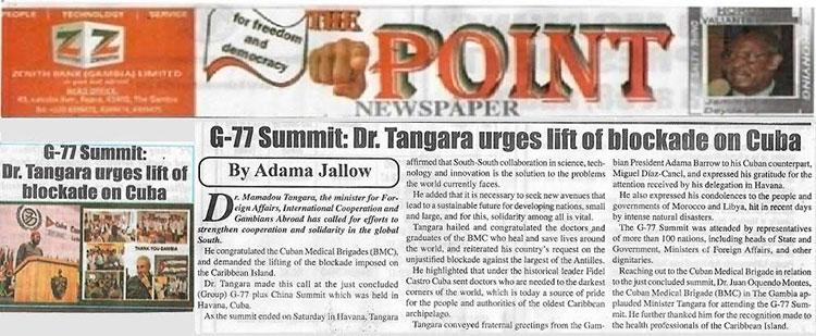 Con anuncio en portada y bajo el título Dr. Tangara, insta a levantar el bloqueo a Cuba, el periódico The Point resalta hoy la intervención del ministro de Asuntos Exteriores gambiano en la recién concluida Cumbre del G77 y China en La Habana.