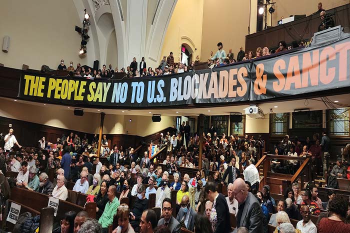 “Nos sentimos muy emocionados y conmovidos, dijo, al estar participando en este acto de solidaridad de ustedes, las voces dignas de los Estados Unidos, las voces dignas del pueblo norteamericano, dando un enorme apoyo a Cuba y Venezuela, a nuestras revoluciones hermanas, diciendo No a las sanciones y a los bloqueos”.