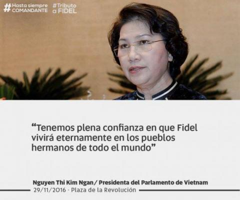 La entonces Presidenta de la Asamblea Nacional de Vietnam, Nguyen Thi Kim Ngan, fue la primera visitante en llegar a las honras fúnebres del Comandante en Jefe, para transmitir las condolencias en nombre de su Partido, Gobierno, Estado y pueblo.